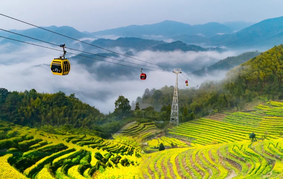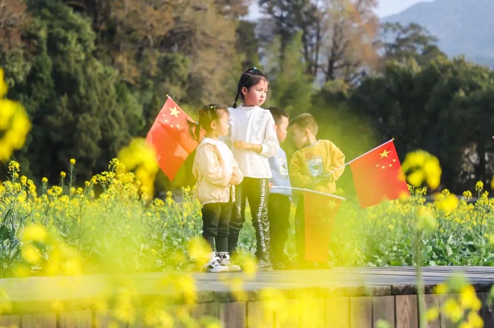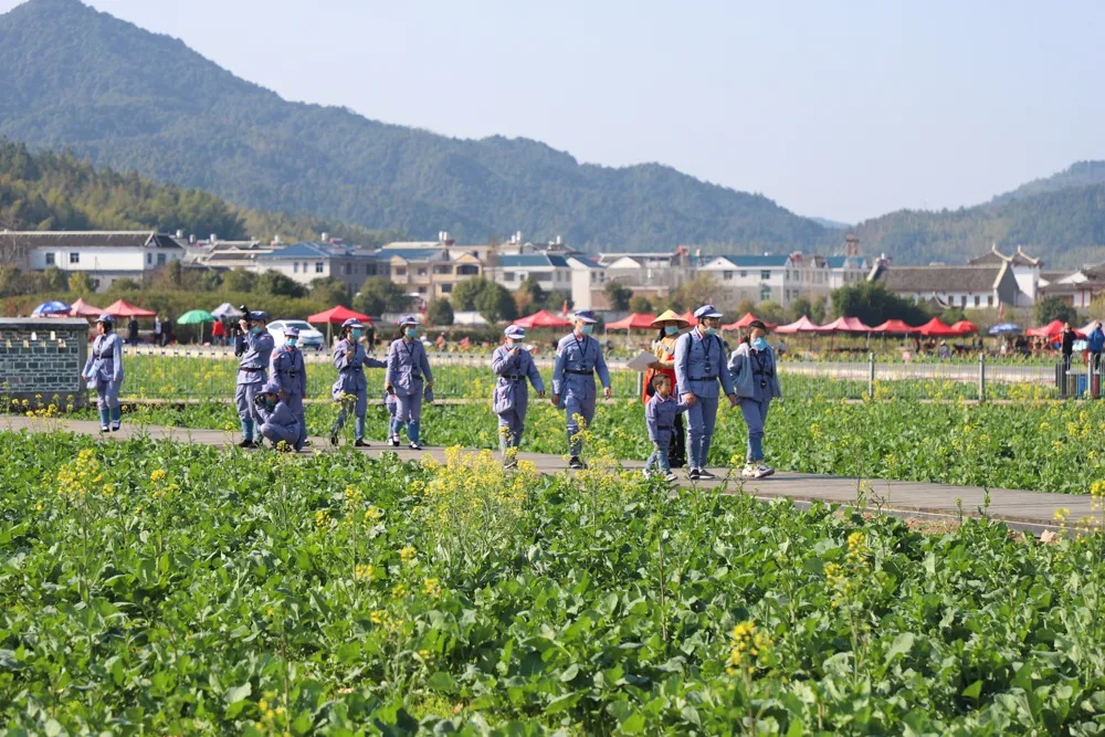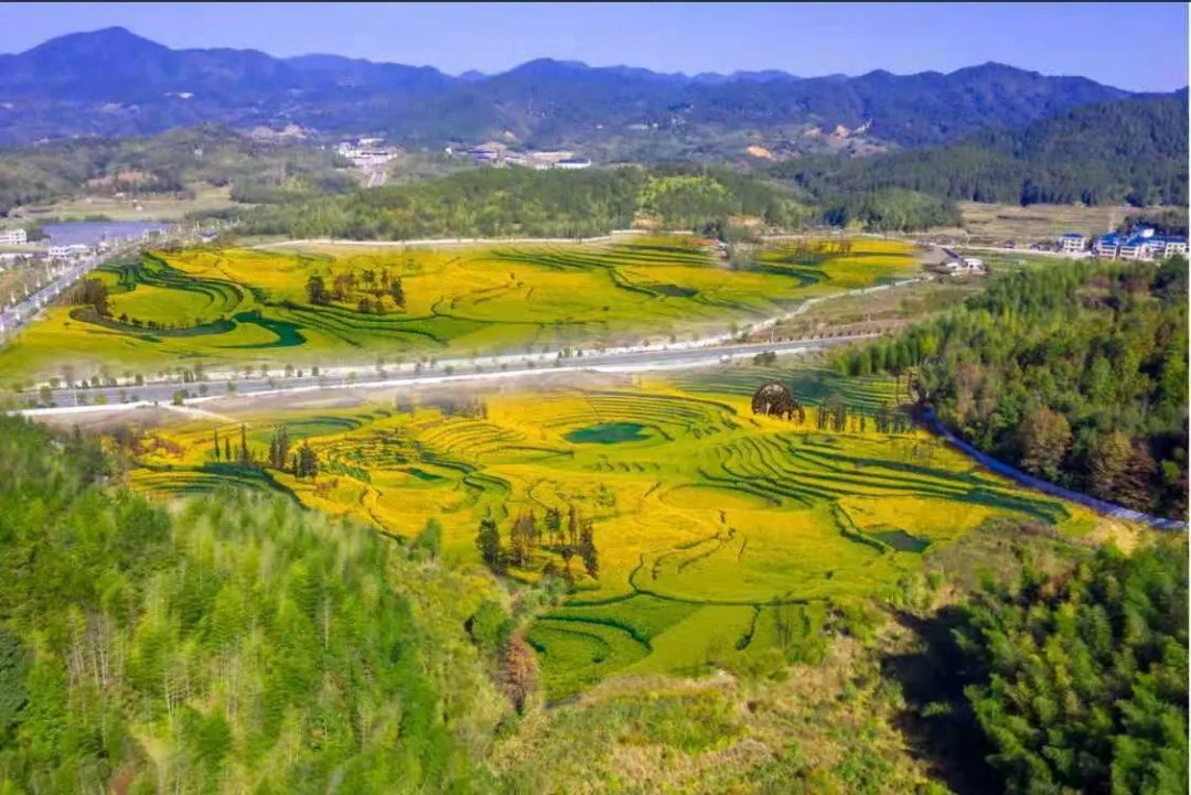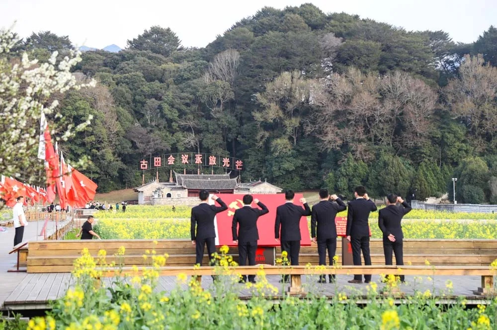 近日,位于福建省龙岩市上杭县的古田会议会址旁,油菜花海绽放,美不胜收。