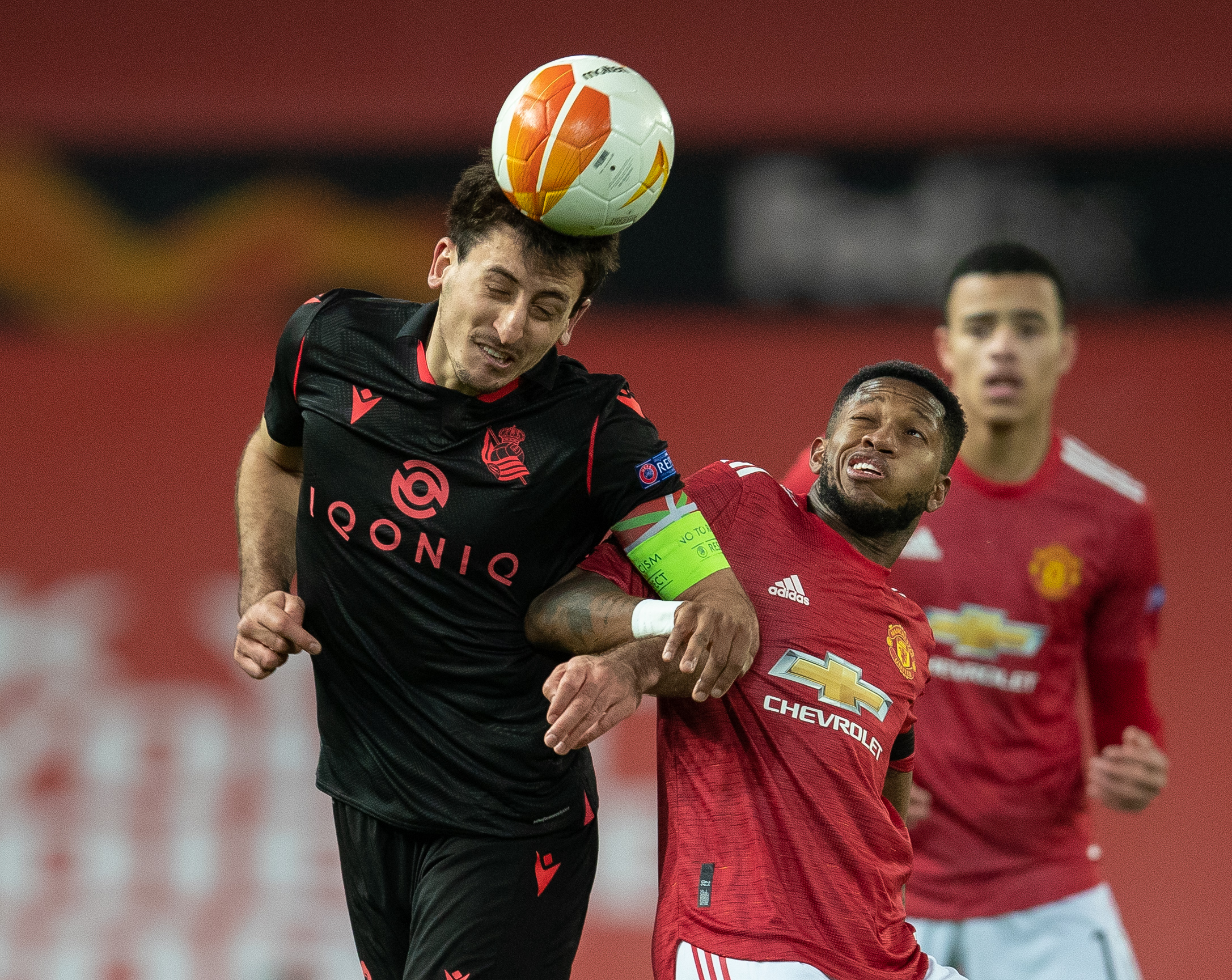 2月25日,皇家社会队球员奥亚萨瓦尔(左)与曼联队球员弗雷德争顶头球。新华社发(马丁摄)