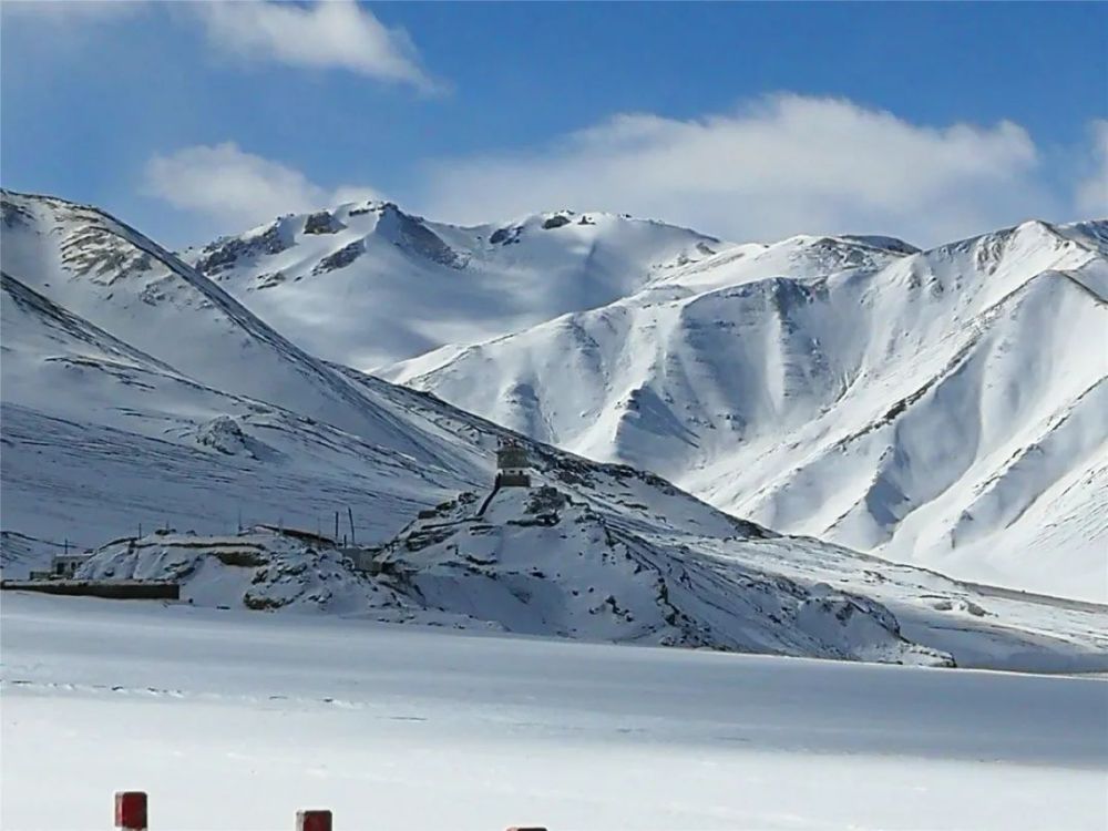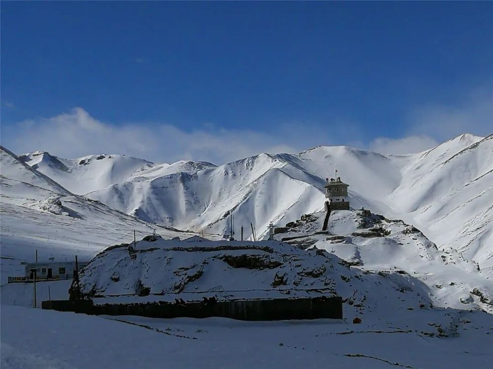 隆冬时节的中印边境喀喇昆仑山口已是白雪茫茫,全天气温均在零下二三十摄氏度,五六级大风寒冷刺骨,吹透了记者穿着的军大衣。从海拔3780米的赛图拉镇出发,前往260多公里外海拔5000多米的天文点边防连,一路雪山连绵。