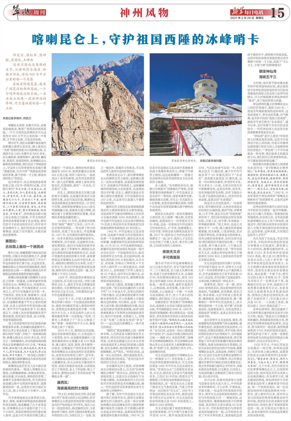 中华文明的许多神话故事就来源于昆仑高地,新时代驻守于此的边防官兵们,终年坚守在冰峰哨卡上,他们用浴血守边的英雄事迹,创造了壮怀激烈、永载史册的民族精神。