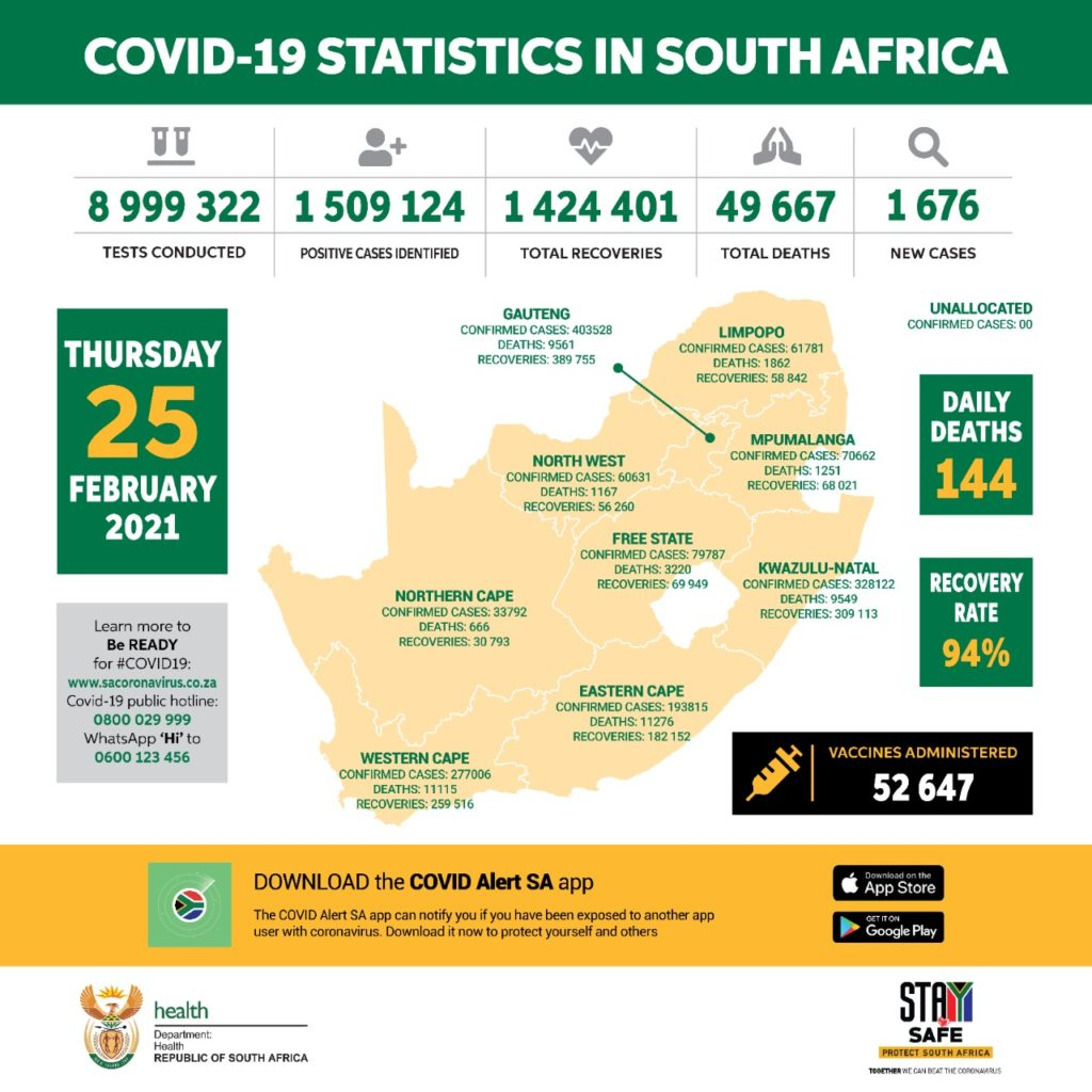 当地时间2月25日,南非卫生部确认南非当日新增新冠肺炎确诊病例1676例,累计确诊1509124例;新增死亡病例144例,累计死亡49667例;累计治愈1424401例。
