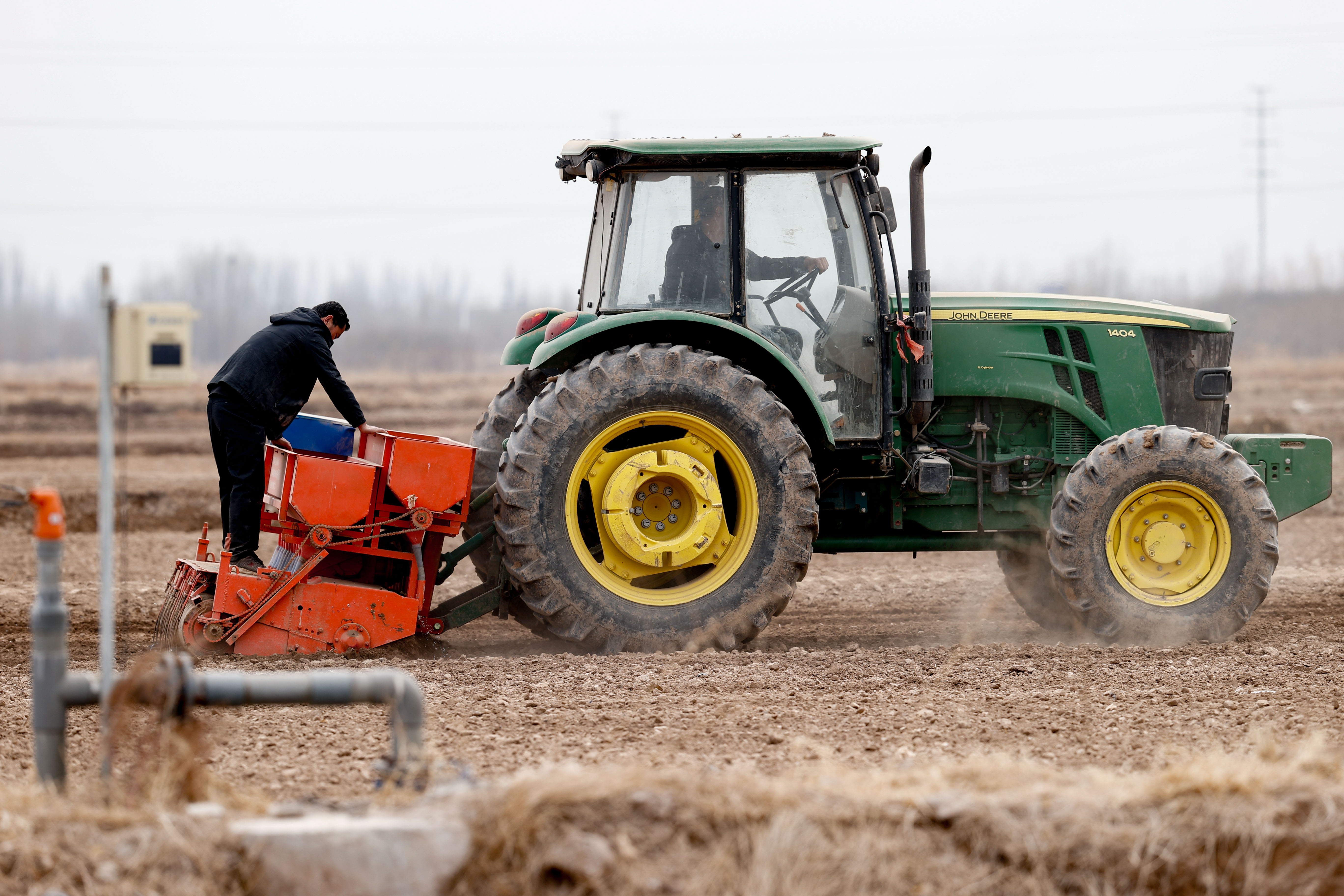 早春时节,宁夏银川市贺兰县金贵镇红星村的农田里传来隆隆的马达声。一台大型农机刚刚驶过,一群种植户便走上前来,蹲着用手指拨弄土壤,像是在翻找着什么。