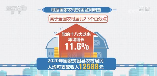 根据国家农村贫困监测调查,2020年国家贫困县农村居民人均可支配收入12588元,党的十八大以来年均增长11.6%,高于全国农村居民2.3个百分点。