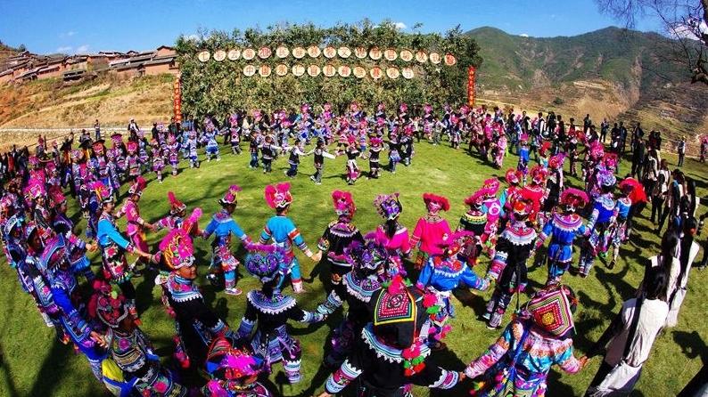 2月26日上午,千年赛装如期上演。村民们身着精美彝族刺绣服饰,载歌载舞、争奇斗艳。尽情展示彝族人民的聪明智慧和高超刺绣技艺,一起欢乐闹元宵。(总台央视记者 李腾飞 徐小龙 永仁融媒)