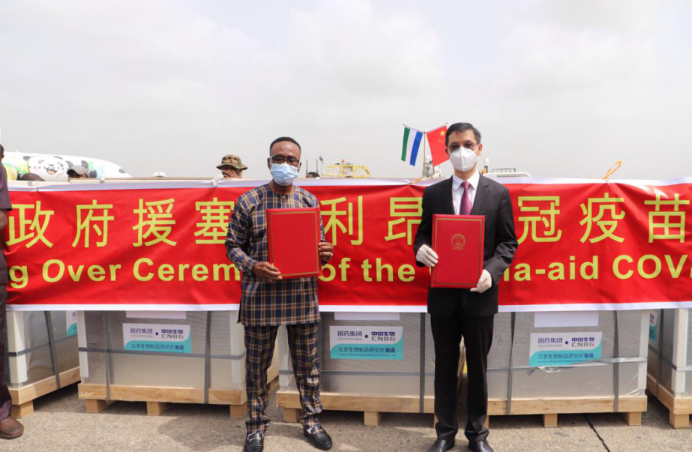 疫苗抵达当天,塞拉利昂卫生部代部长桑迪、外交与国际合作部副部长兼国家新冠疫情应急指挥中心发言人贾米鲁等政府高级官员以及驻塞拉利昂大使胡张良等使馆人员前往机场迎接。(总台记者 何北平)