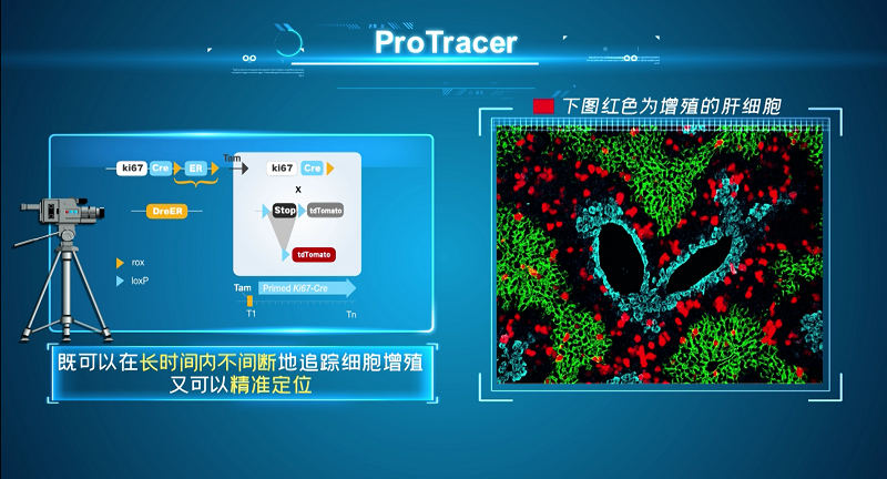 科研团队开发了一种能够捕捉细胞增殖的录像机——ProTracer,既可以在长时间内不间断地追踪细胞增殖,又可以精准定位,追踪某一特定细胞类群的细胞增殖,让黑夜中只有被锁定目标的“星群”发光,而不是在满天繁星中找寻其中的一两颗。在小鼠实验中,他们利用这项技术,给增殖的肝细胞打上“唯一标记”,经过长达数周至数月的“密切”追踪,最终发现成体肝脏中新生肝细胞主要来源于肝小叶中间区域的肝细胞。