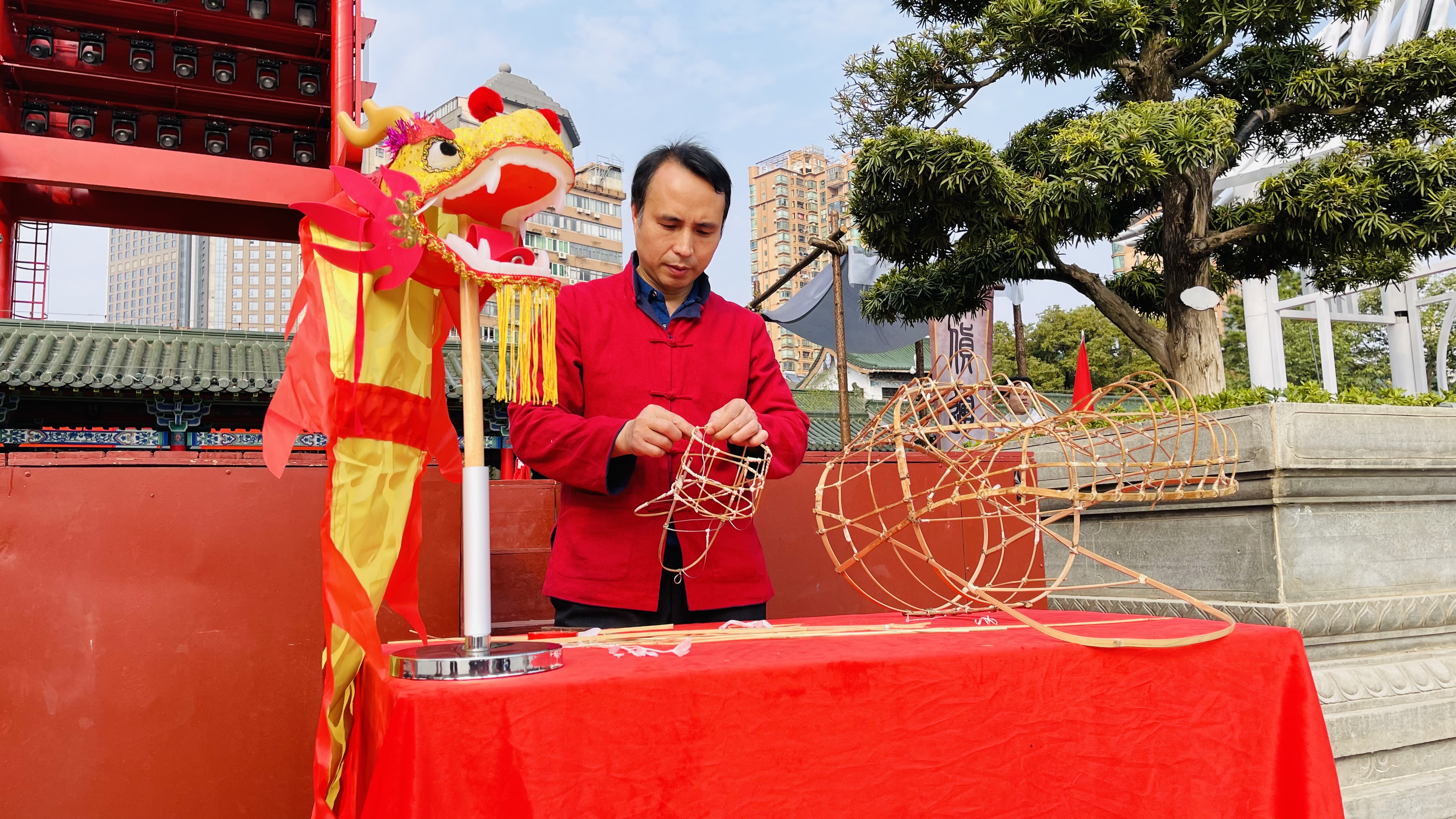 破篾、扎竹圈、编龙头……表演台上,江西省级非遗“城南龙灯”的传承人史克滨手上动作不停,一只竹制龙头骨架渐渐成型。