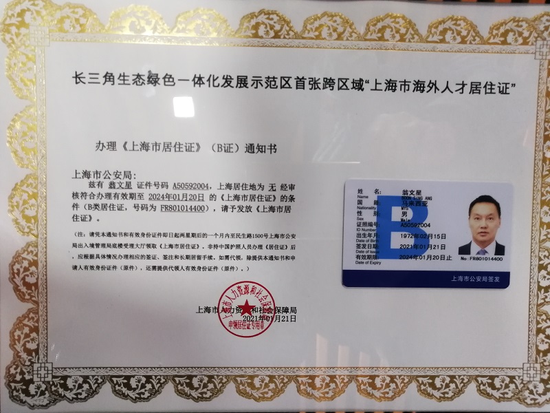 首位获得长三角一体化示范区内上海市海外人才居住证的外籍人才是来自马来西亚的翁文星先生,为该公司总经理。此次颁发的是上海市面向非在沪工作外籍人士的首张上海市海外人才居住证。