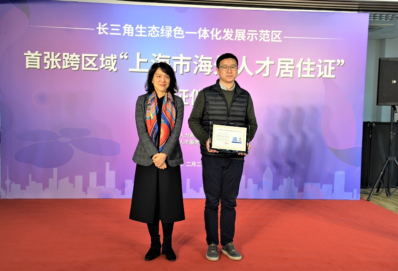 在上海市人力资源和社会保障局与长三角生态绿色一体化发展示范区执委会的大力支持下,在上海青浦和苏州吴江两地人社部门的共同努力下,2月26日,上海市青浦区委副书记杨小菁为苏州市吴江区下辖苏州某公司企业代表颁发了首张上海市海外人才居住证。
