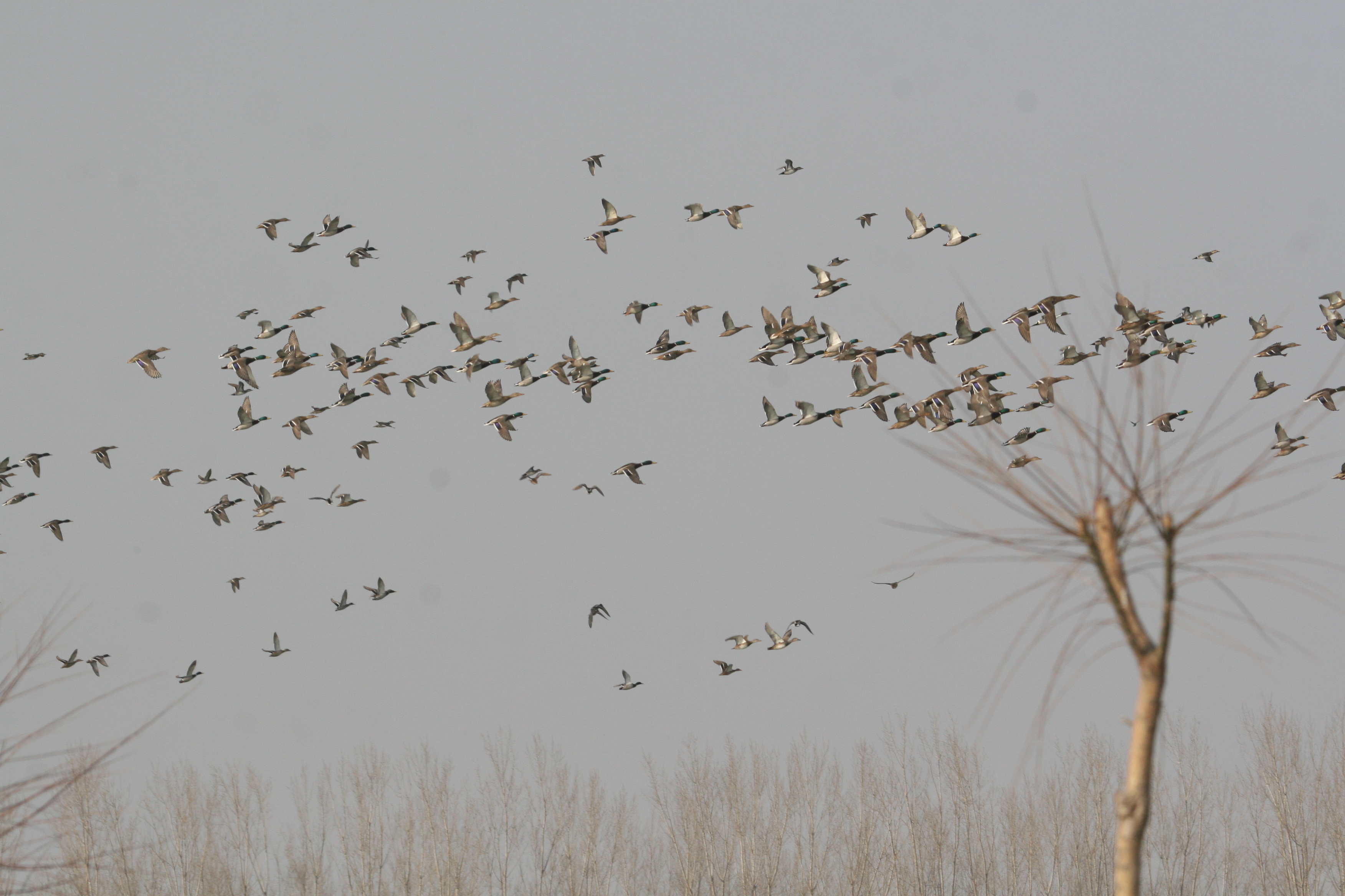 白洋淀上空飞翔的绿头鸭、斑嘴鸭 (摄影:安新县自然资源局工作人员齐明)