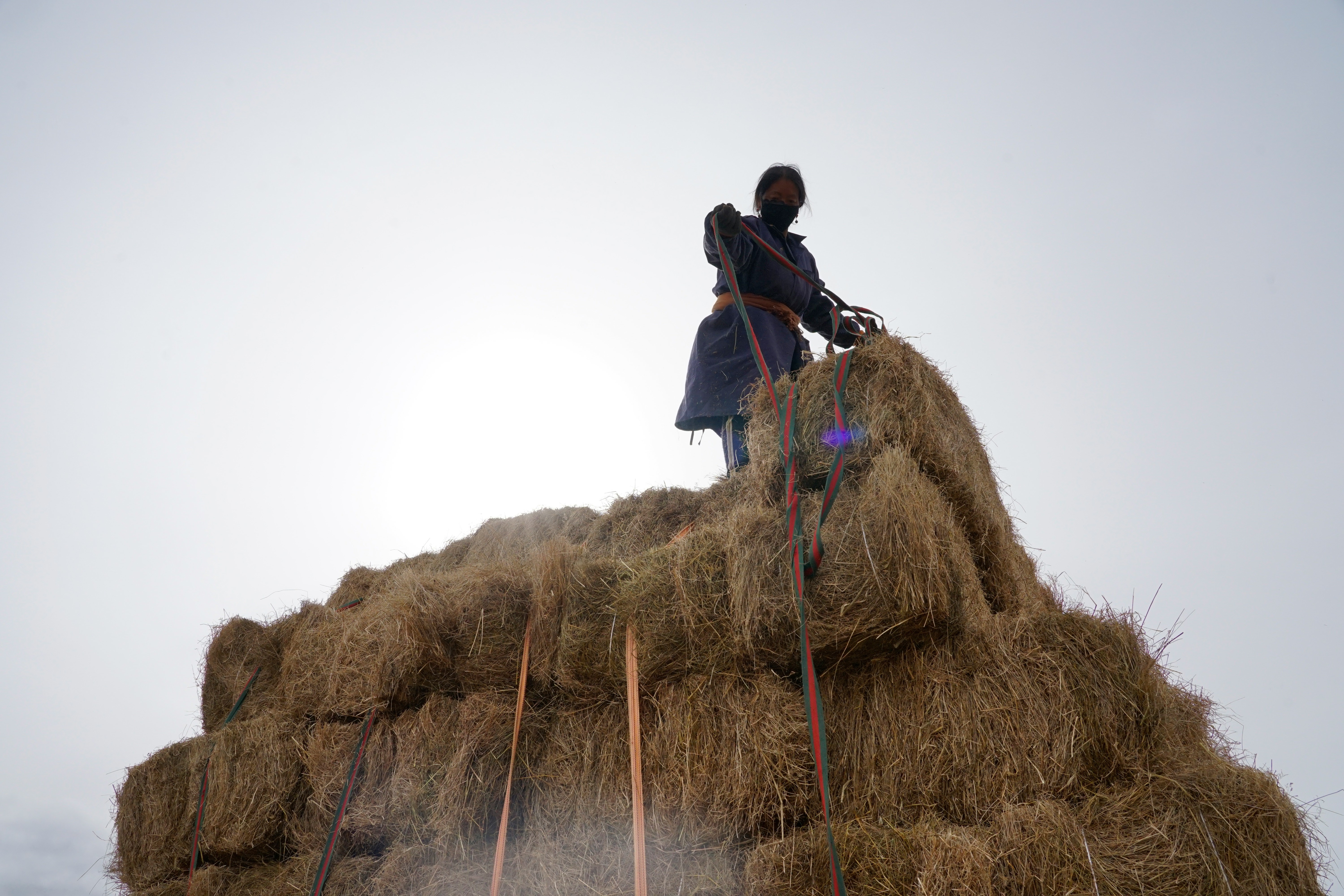 在青海省果洛藏族自治州甘德县江千乡,牧民华吾正在搬运饲草。(2020年11月3日摄)。新华社记者解统强 摄