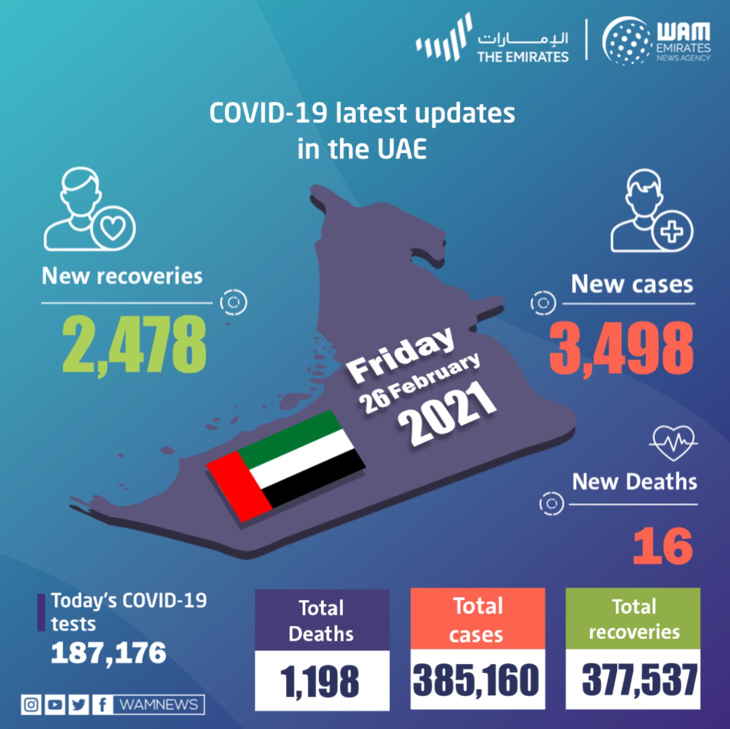 当地时间2月26日,阿联酋卫生和预防部通报该国新增3498例新冠肺炎确诊病例,同时新增2478例治愈病例,新增16例死亡病例。至此阿联酋境内新冠肺炎确诊病例累计达385160例,其中治愈病例377537例,死亡病例1198例。