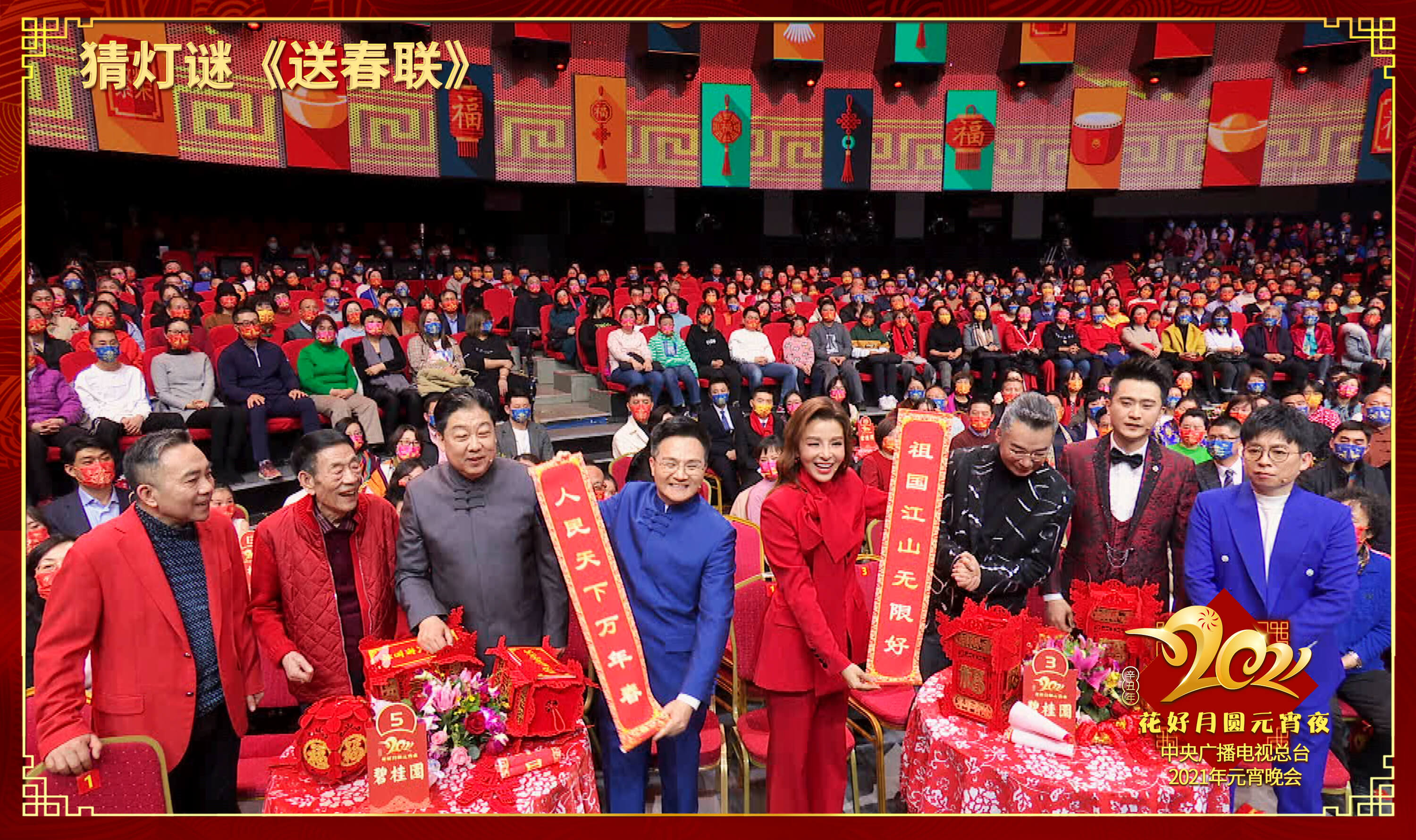 品元宵、猜灯谜的传统习俗也被巧妙地穿插在节目中,彰显了传统文化之美。总台主持人与相声演员分为两组,互动打擂闹元宵。拜年、送春联等环节妙趣横生,将年味儿诠释得淋漓尽致。在这个“千里共婵娟”的时刻,向全国各族人民、港澳台同胞,以及全球的华侨华人朋友们送上节日的深情祝福,用对联等形式鼓励大家奋斗耕耘,再创佳绩。