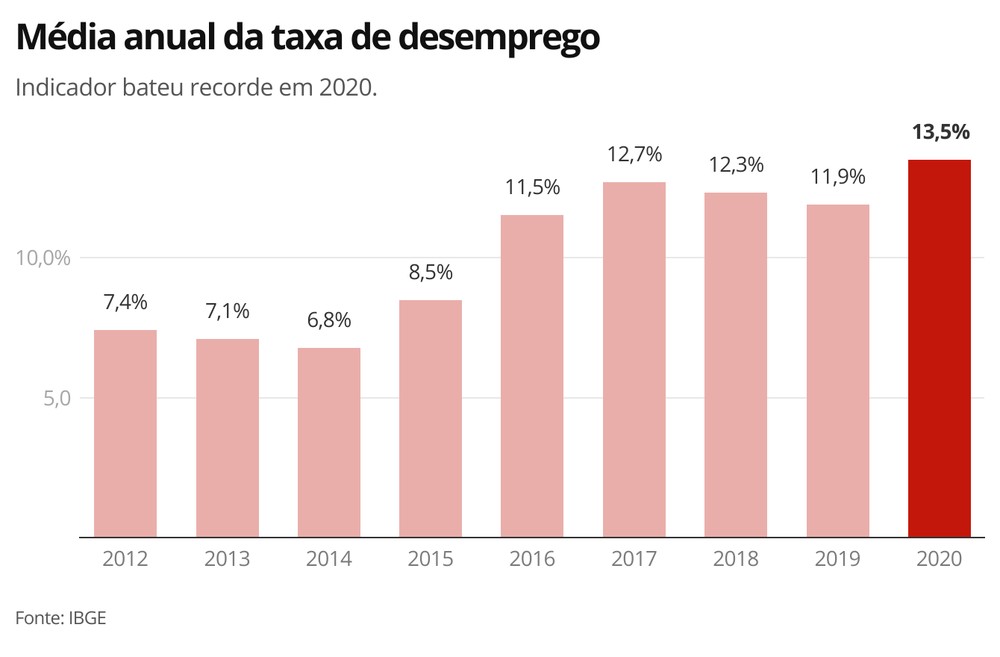 巴西经济部所属的地理和统计研究院(IBGE)2月26日公布的数据显示,巴西2020年失业率达到13.5%,为该机构2012年有此统计以来最高的一年。