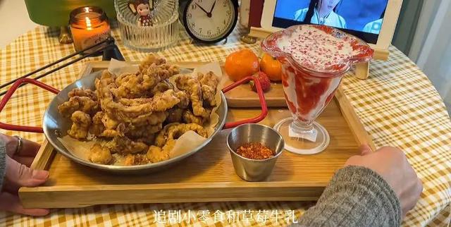 中午给自己炸上一锅小酥肉,再自制一杯草莓牛乳,边追剧边享受美食;