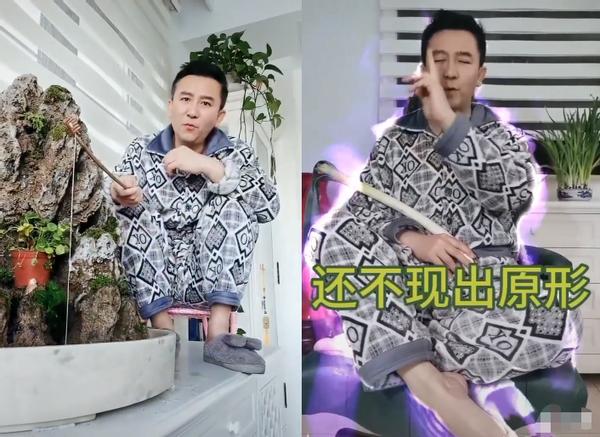 在家里拿着鱼竿蹲坐在假山盆景旁佯装钓鱼,拍短视频自娱自乐;