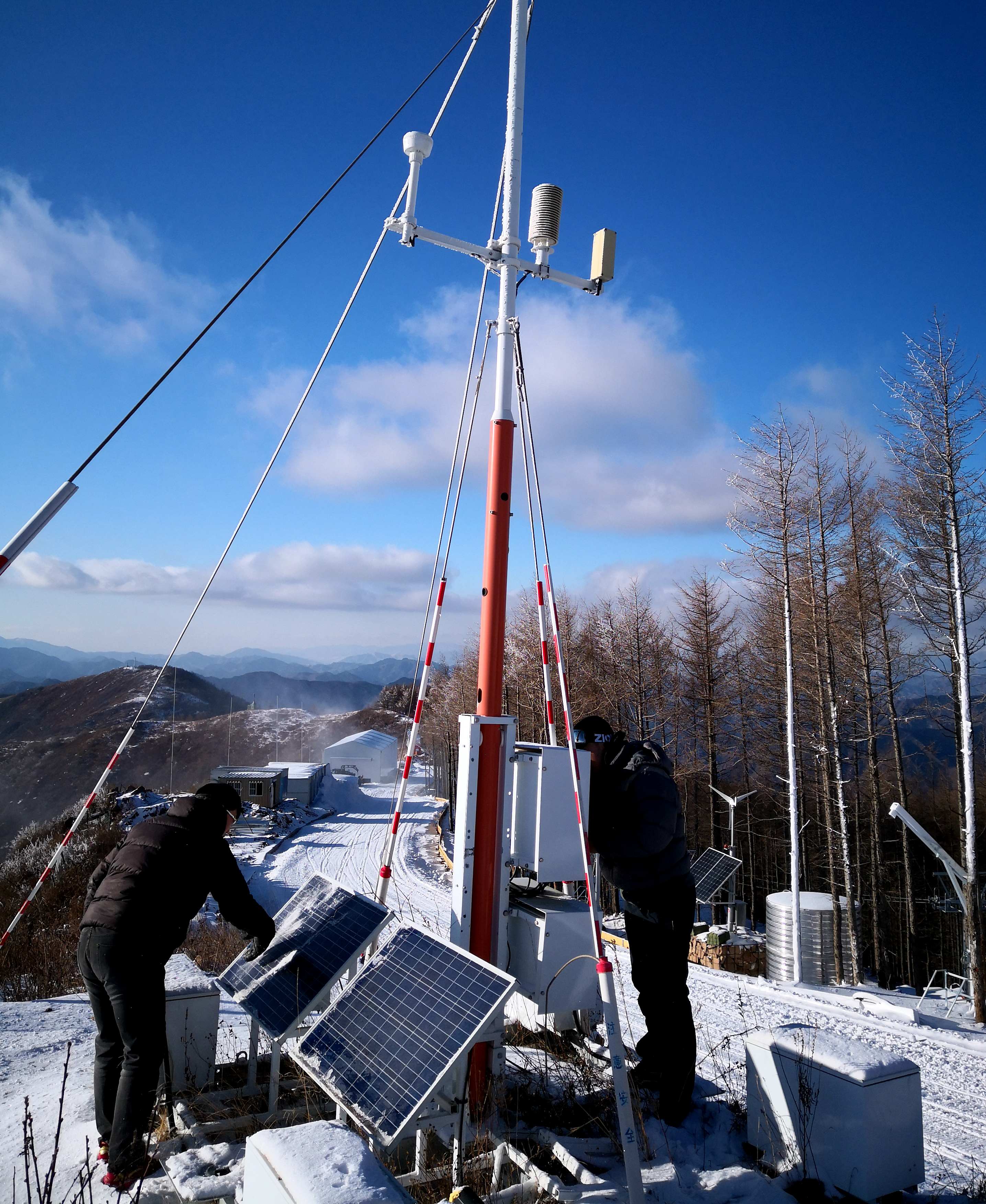 闫宏亮(左)在赛区维护气象自动站,清理降雪过后太阳能板上的浮雪