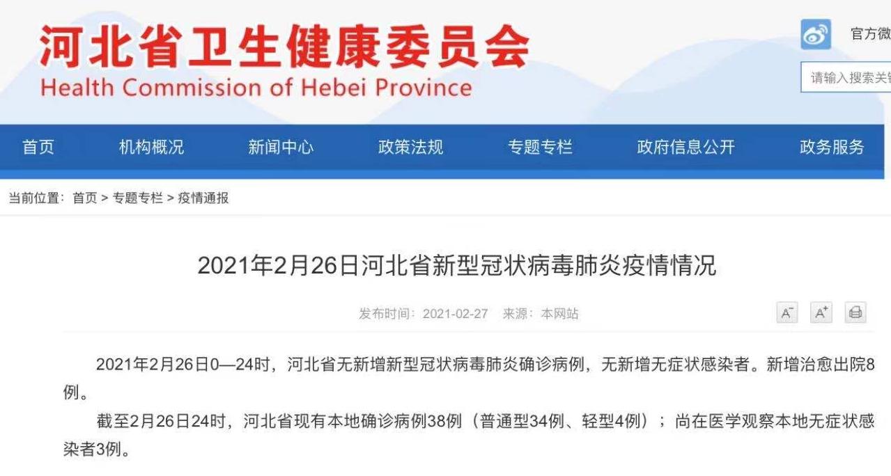 2021年2月26日0—24时,河北省无新增新型冠状病毒肺炎确诊病例,无新增无症状感染者。新增治愈出院8例。