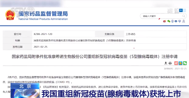 25日,国家药监局根据《疫苗管理法》和《药品管理法》的相关规定,按照药品特别审批程序,进行应急审评审批,附条件批准了重组新冠疫苗(腺病毒载体)的上市注册申请,并要求上市许可持有人继续开展相关研究工作,完成附条件的要求,及时提交后续研究结果。