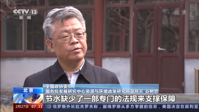 全国政协委员、国务院发展研究中心资源与环境政策研究所副所长 谷树忠:我从事资源环境这个问题研究已经有三十六七年的时间了。我们国家是一个严重缺水的国家,我们六百多座城市,基本上有三分之二是缺水的,所以节水是水问题的一个核心。