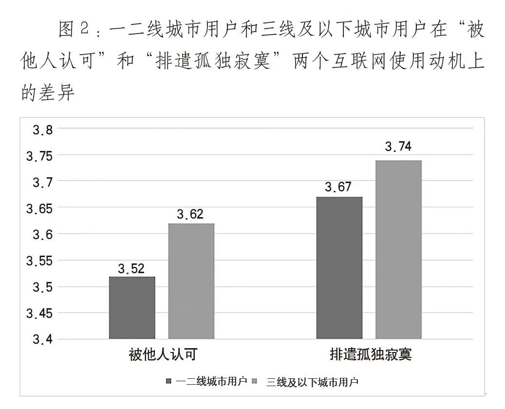 (二)鼓励用户表达,打造本地“同城”社交圈。用户生产内容是网络平台的基础性资源。县级融媒体中心客户端要真正成为地方具有影响力的“平台”,必须为用户的自我表达保留空间、创新方式,并形成相应的激励和保障机制。我研究团队的调查数据[14]显示(如图2所示),在互联网使用动机上,三线城市及以下的用户较一、二线城市用户更看重“被他人认可”(p