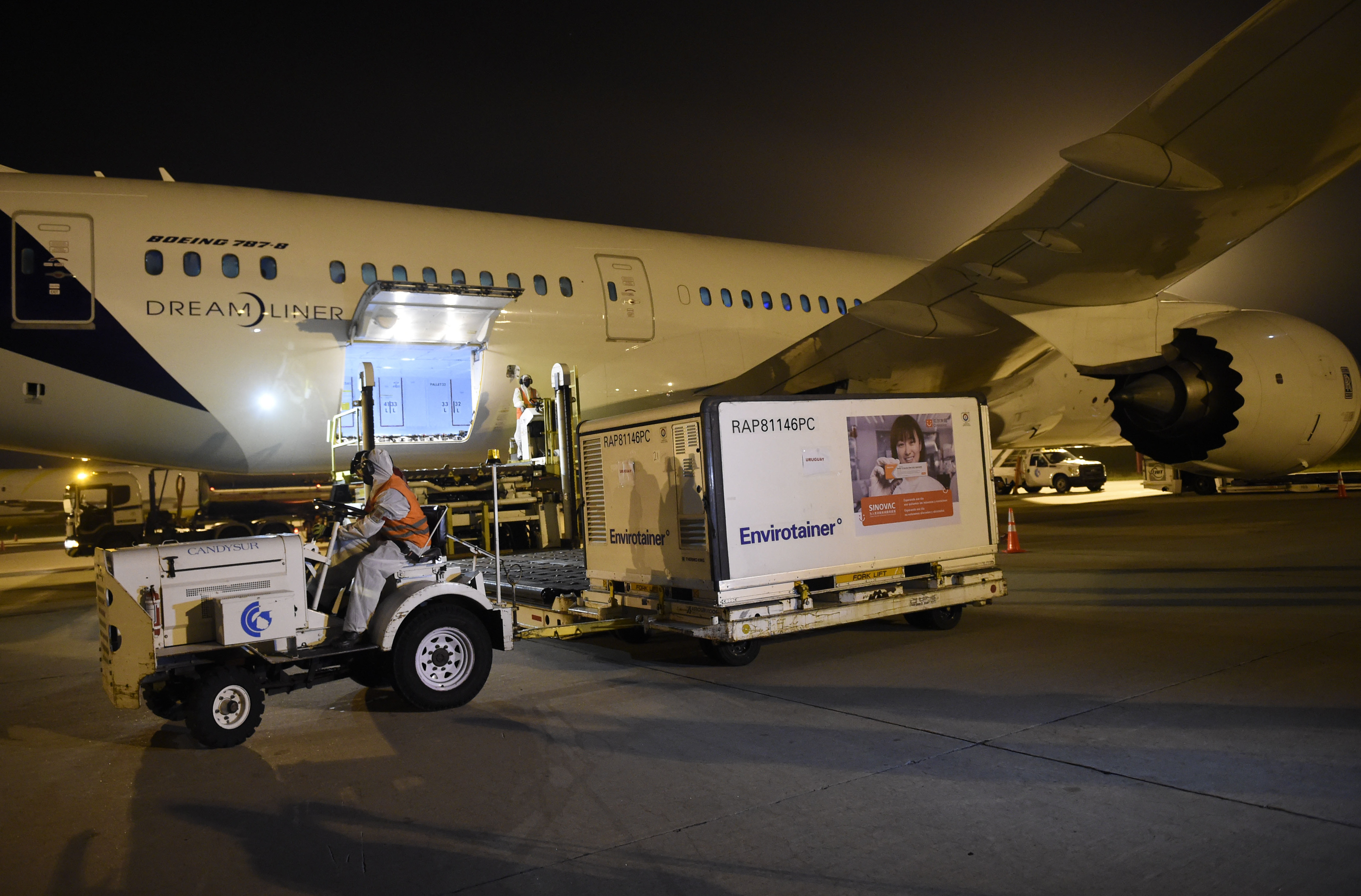 2月25日晚,乌拉圭政府采购的首批中国科兴新冠疫苗运抵乌拉圭首都蒙得维的亚。(新华社发,尼古拉斯·塞拉亚摄)