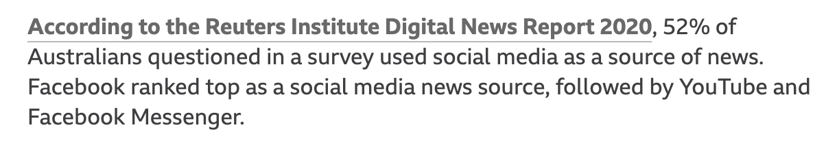路透社研究所的一个调查显示,现在52%的澳大利亚人将社交媒体作为新闻来源。脸书作为社交媒体新闻来源排名第一,其次是YouTube和Facebook Messenger。流量和收入息息相关,现在在澳大利亚网络上每投入100美元的广告,谷歌获得53美元,脸书拿走28美元。