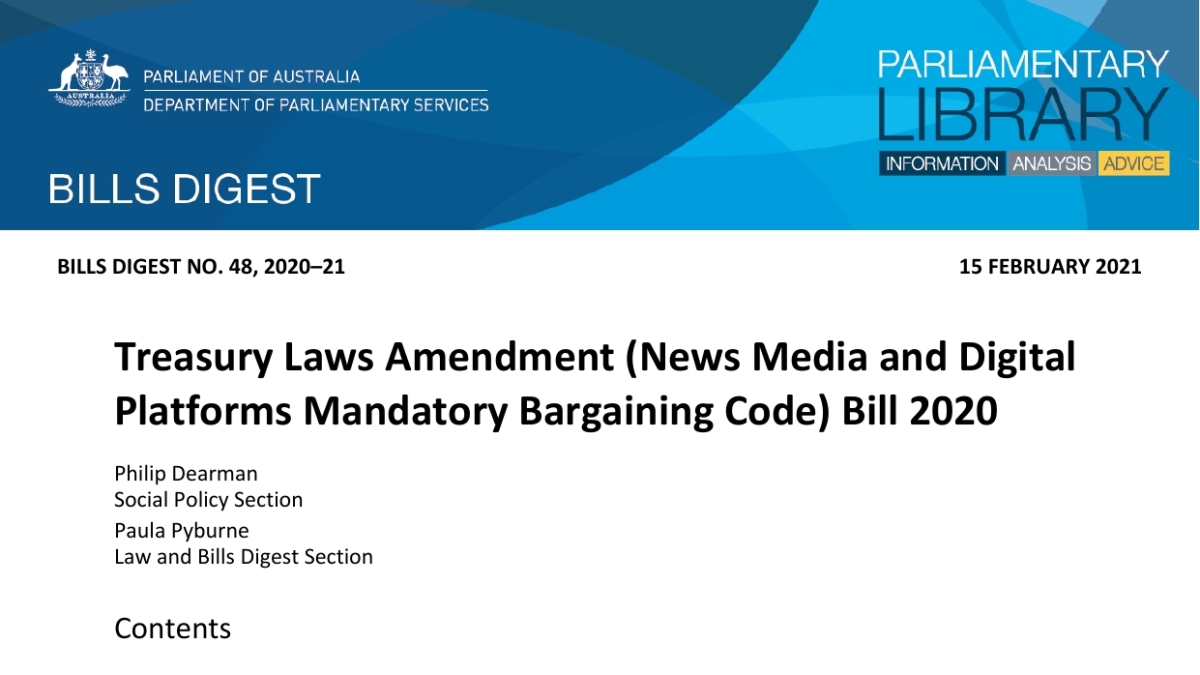 2020年12月9日,澳大利亚财政部提出了全球首个平衡利益分配不均、提升媒体议价能力的立法,叫《新闻媒体和数字化平台强制议价准则》。矛头直指美国互联网公司脸书和谷歌,希望解决本国媒体因美国科技公司而广告收入减少的问题。