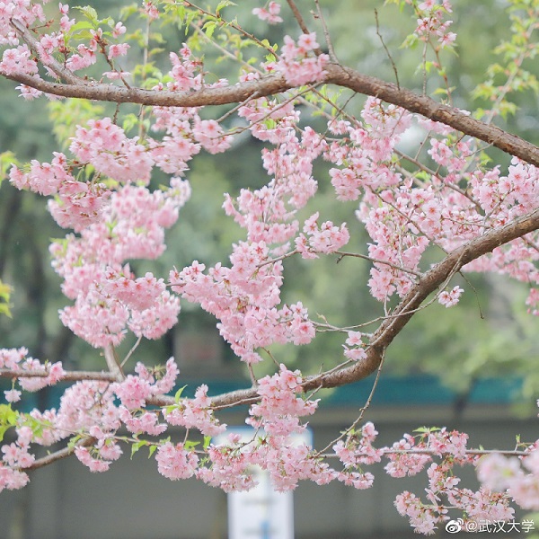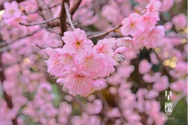 在明媚的春光里, 武汉大学珞珈山上的早樱开了!