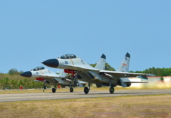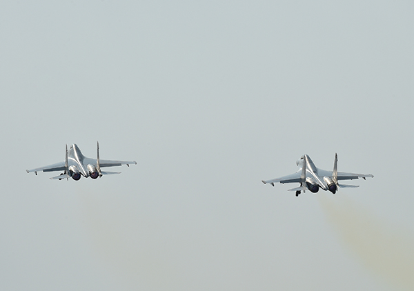 双机编队升空,赴目标空域开展对抗训练。高宏伟 摄