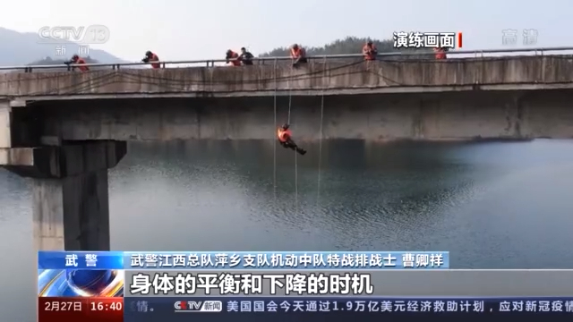 武警江西总队萍乡支队机动中队特战排战士 曹卿祥:桥梁索降不同于我们平时训练的房屋索降。桥梁索降在下降的过程中受风力的影响不利于控制身体的平衡和下降的时机,所以在下降的过程中我们要克服风力的影响,抓准时机精准下落。