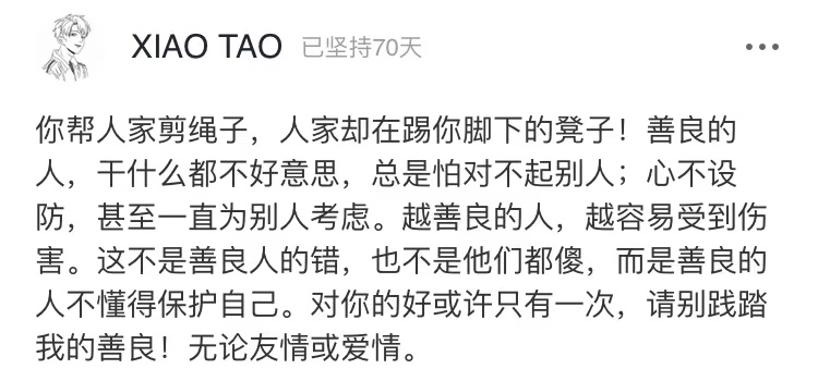 言偃:没有底线地释放善意,最后往往就变成他人眼中的懦弱。善良是良好品质,但你的善良又必须有点锋芒,温柔又坚定,方才恰到好处。