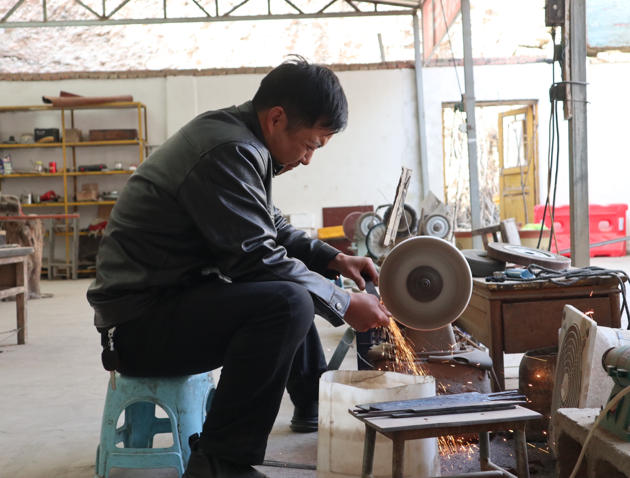 马白克对保安腰刀的刀坯进行抛光。(新华社记者张百慧摄)