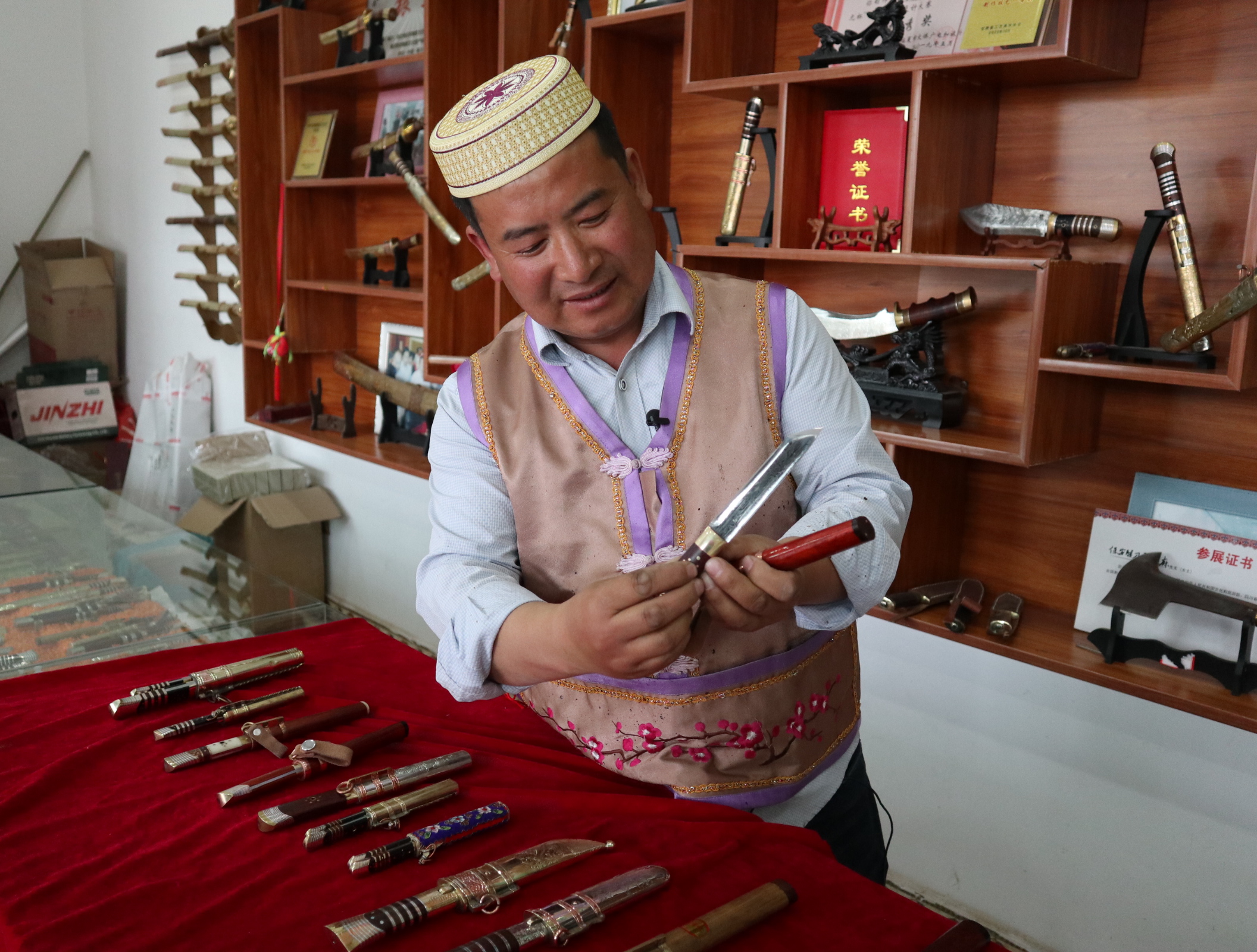 马尕主麻正在展示创新后的保安腰刀。(新华社记者张百慧摄)