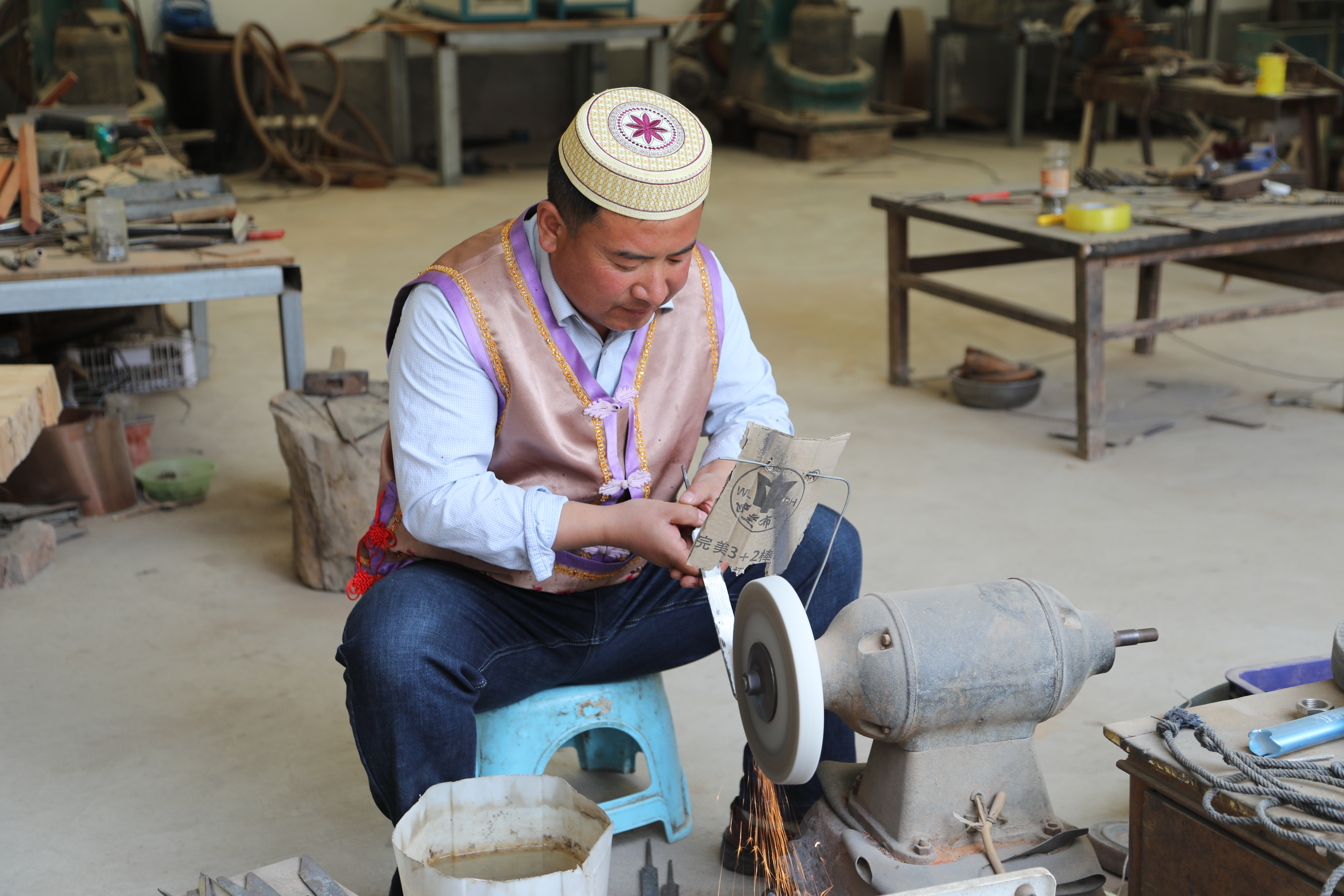 马尕主麻正在对保安腰刀的刀坯进行抛光。(新华社记者马莎摄)