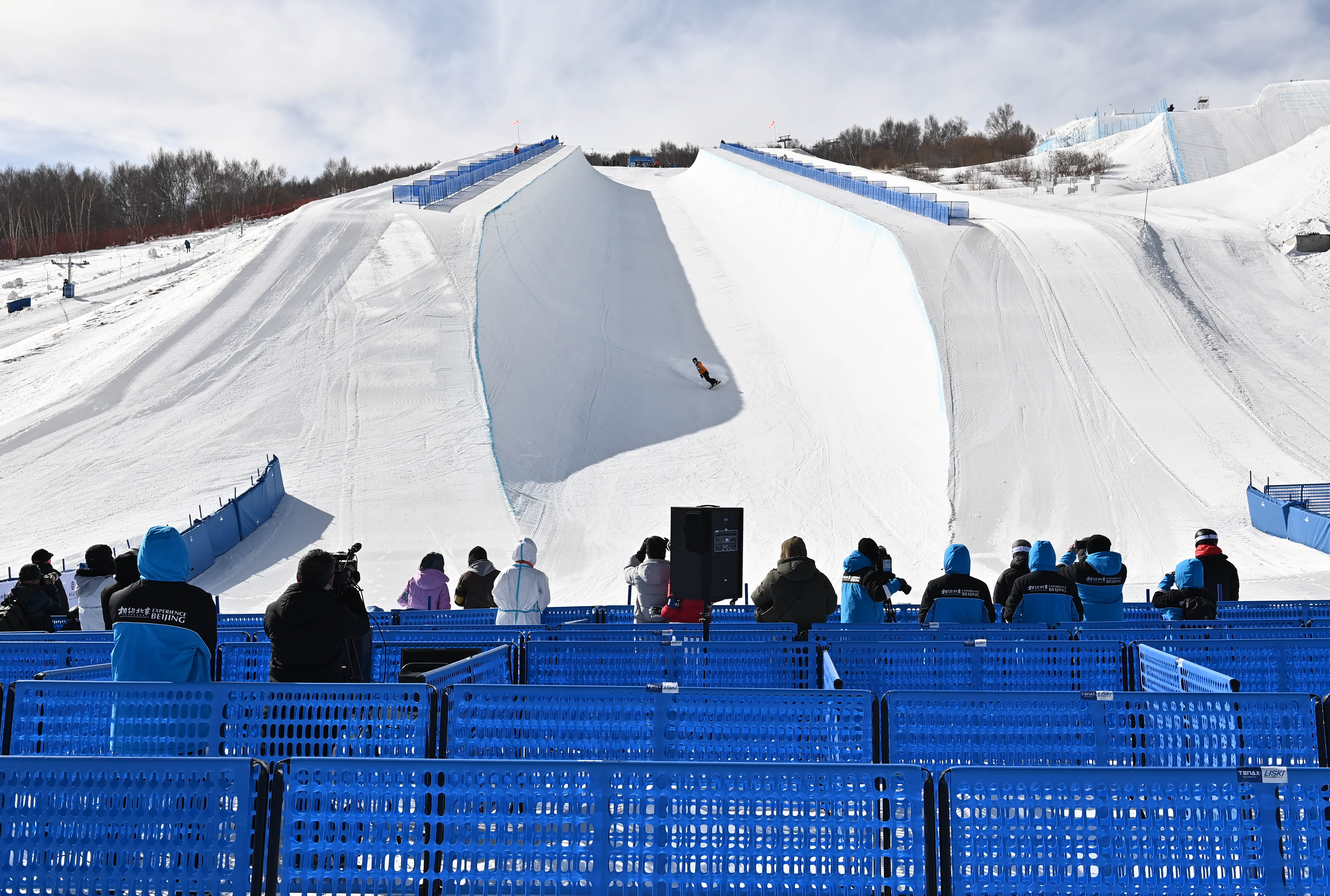 2月20日,北京冬奥会和冬残奥会举行测试活动,图为工作人员在张家口赛区云顶滑雪场U型场地前的防疫隔离采访区工作。新华社记者贺长山摄