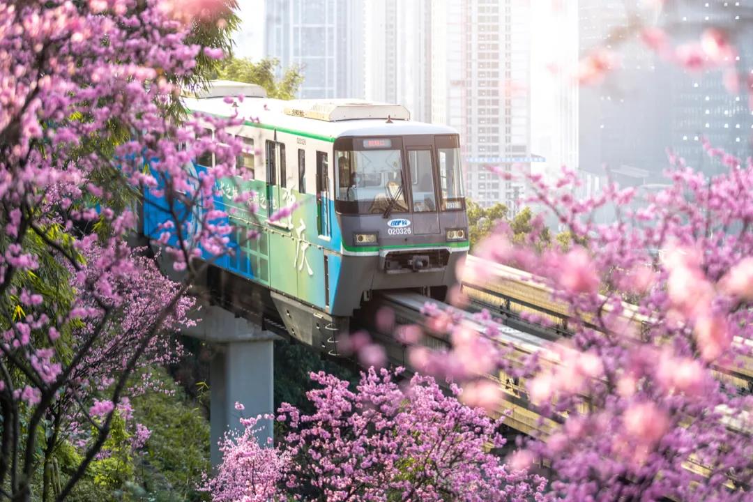 时至二月下旬,春色浸满山城重庆。在渝中区佛图关一带,逶迤连绵的梅花饱含春光,吸引着四面八方的游客前来观赏。除了拍摄美人梅之外,游客们举起手机相机,等待着每几分钟,就会开来一趟的单轨二号线列车。当通体彩色涂装的列车,穿过沿途春花烂漫,被网友称为是“开往春天的列车”。