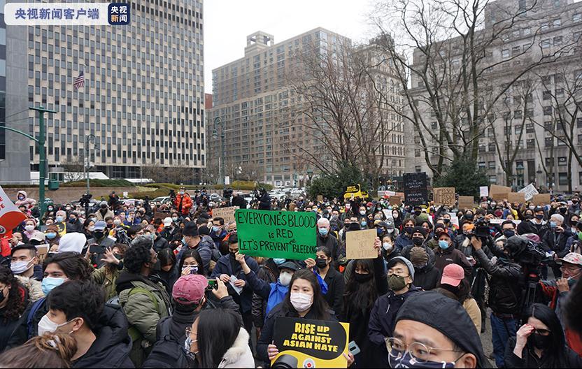当地时间2月27日,美国纽约市多个亚裔团体发起反针对亚裔仇恨犯罪的抗议。当天下午在纽约市政厅附近,数百人参加了抗议活动。