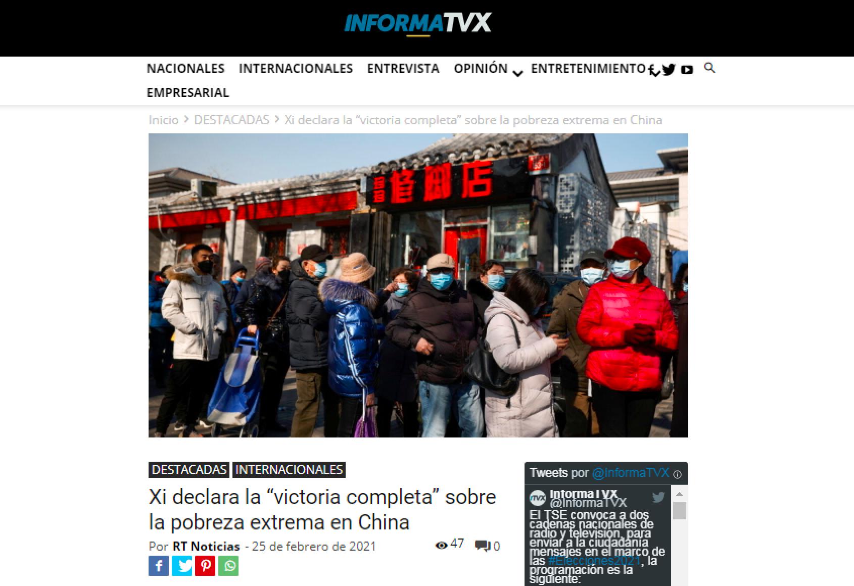 巴西最大媒体环球集团、旗手传媒集团、《世界中心报》、《米纳斯州报》和《这就是杂志》,阿根廷最大媒体《号角报》集团、《国民报》、《侧影报》,拉美最大的西班牙语门户网站“布宜诺斯艾利斯消息网”,秘鲁《秘鲁人报》和《快报》,拉美重要跨国电视新闻网委内瑞拉南方电视台,古巴官方通讯社拉美通讯社,萨尔瓦多TVX电视台等拉美主流媒体,第一时间报道了中国脱贫攻坚战取得全面胜利的消息,并纷纷对中国脱贫成就和对世界经济社会发展发挥的重要作用予以肯定。