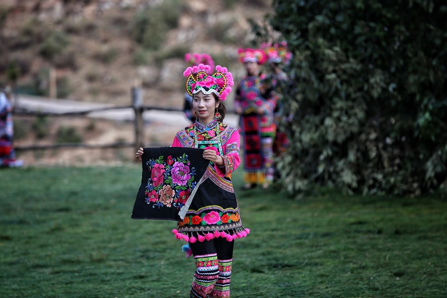 2月26日,一名彝族姑娘在展示她的彝绣作品。新华社发(杨雷 摄)