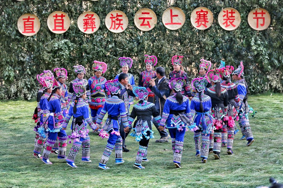 蓝天白云为背景,绿油油的草地成了大舞台。“赛装”比美的同时,彝族的男女老少或纵情歌舞,或跳脚狂欢,尽情表达他们对美好生活的不懈追求与无限向往。