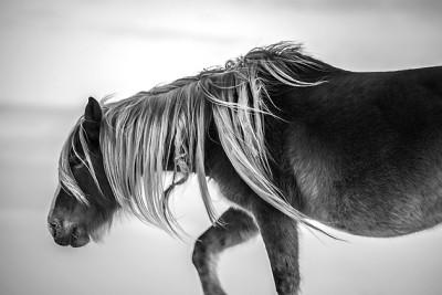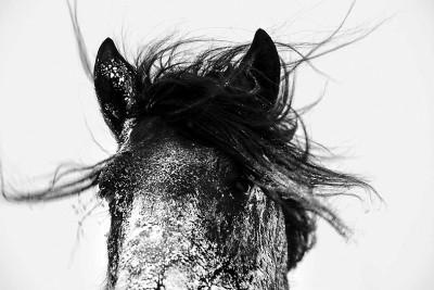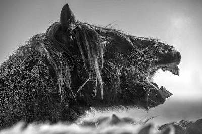 从2015年冬季开始,我在呼伦贝尔草原深处,沿着中蒙、中俄边境的旷野,在看不清马首马尾的暴雪中跟踪马群,以求留下蒙古马坚强与骁勇的雄风。我所拍摄的这些蒙古马,是无拘无束奔跑在冰雪旷野、凛冽寒风中的蒙古马,是在滴水成冰的恶劣环境中依然充满活力、精神抖擞的蒙古马。