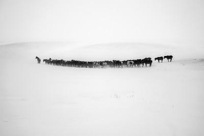 一群蒙古马找到有利位置躲避风雪,领头雄马迎风站在马群前以防顺风走散。