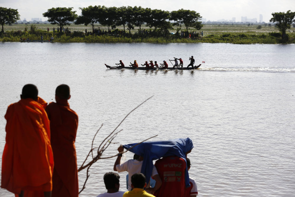 2020年10月30日,在柬埔寨干丹省,柬埔寨百姓观看赛龙舟。(新华社发,索万纳拉摄)