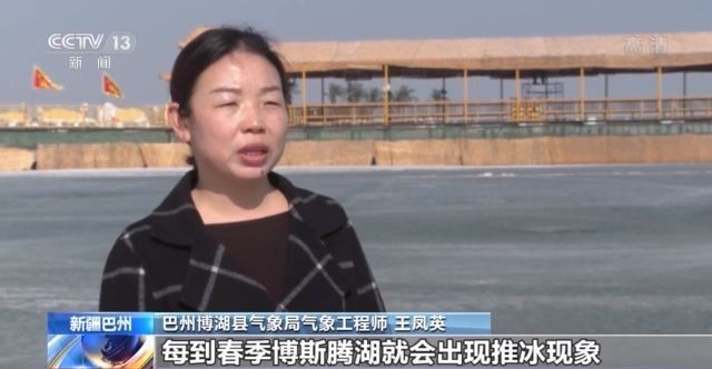 新疆巴州博湖县气象局气象工程师 王凤英:每到春季博斯腾湖就会出现推冰现象。这种现象主要是由于春季气温转暖湖冰开始融化,由于湖水深度不同使得冰层融化不一样,在风力和水流的作用下推动冰层向岸边移动,冰块堆叠形成冰山冰峰等奇特景观。风越大冰层被推起的越高,今年由于气候回暖较快,推冰现象也较往年提前了近15天左右。