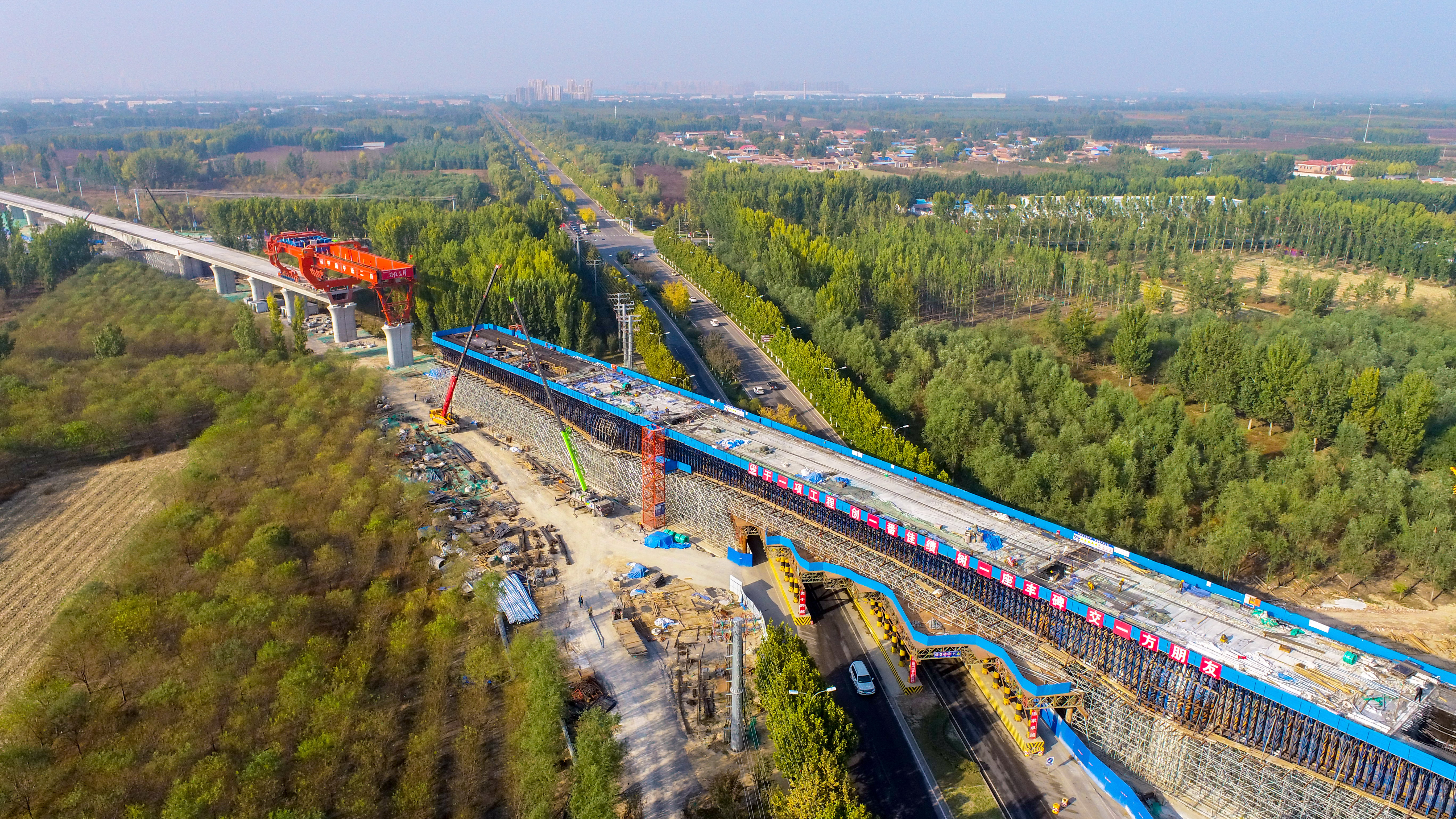 这是2021年2月22日拍摄的京唐城际铁路河北廊坊段施工现场。廊坊市委宣传部供图