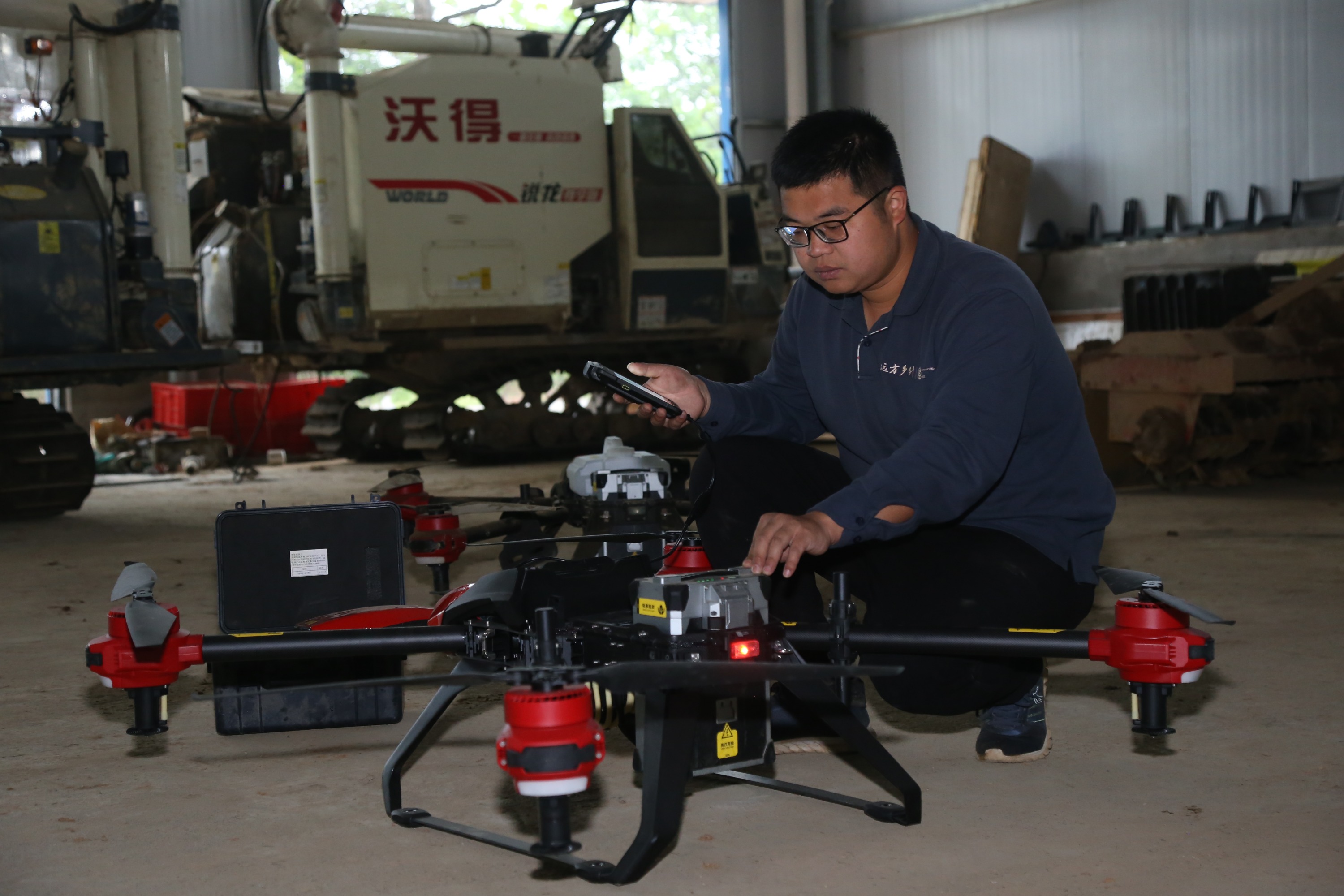 ↑江西高安市石脑镇“90后”种粮大户丁旦在检修农业无人机。(资料照片,高安市委宣传部提供)
