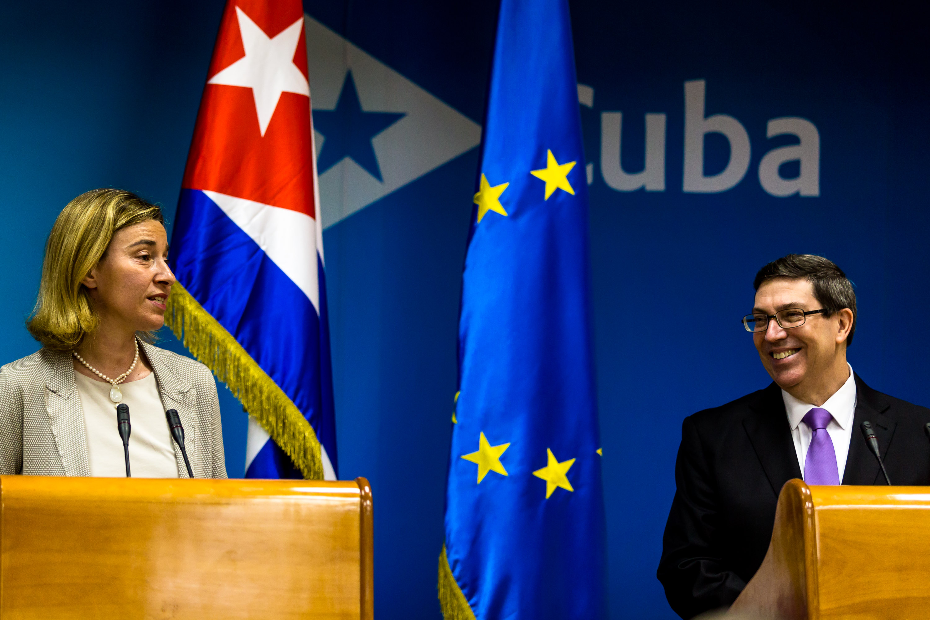 2016年3月11日,在哈瓦那,古巴外长罗德里格斯(右)与时任欧盟外交和安全政策高级代表莫盖里尼出席联合新闻发布会。(新华社记者刘彬摄)