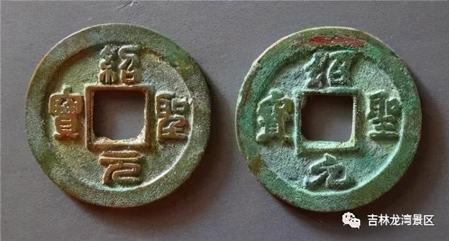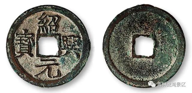 “绍圣元宝":宋哲宗绍圣年间(公元1094-1097年)铸,钱文分篆、行两种,钱径有3.1和2.3厘米两种。