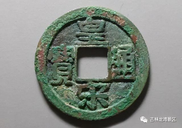 “皇宋通宝":宋仁宗宝元二年(公元1039年)铸。钱文分篆、楷两种,对读,钱径2.5厘米,穿径0. 7厘米。